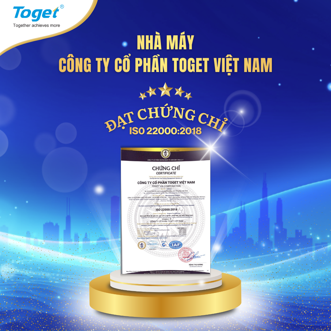 Nhà máy sản xuất của Công ty Cổ phần Toget Việt Nam đã chính thức được tổ chức đánh giá độc lập cấp chứng nhận ISO 22000:2018 – tiêu chuẩn quốc tế về hệ thống quản lý an toàn thực phẩm. Đây được xem là một trong những cột mốc quan trọng trên hành trình phát triển của Toget Việt Nam, đặc biệt trong bối cảnh ngành sản xuất – kinh doanh thức ăn chăn nuôi gia súc, gia cầm đang ngày càng đặt ra yêu cầu cao đối với an toàn và chất lượng sản phẩm.