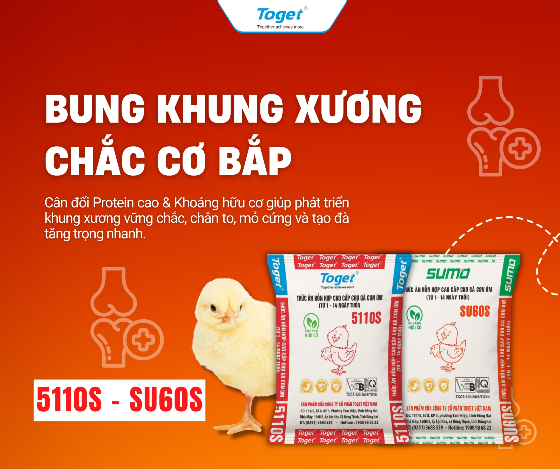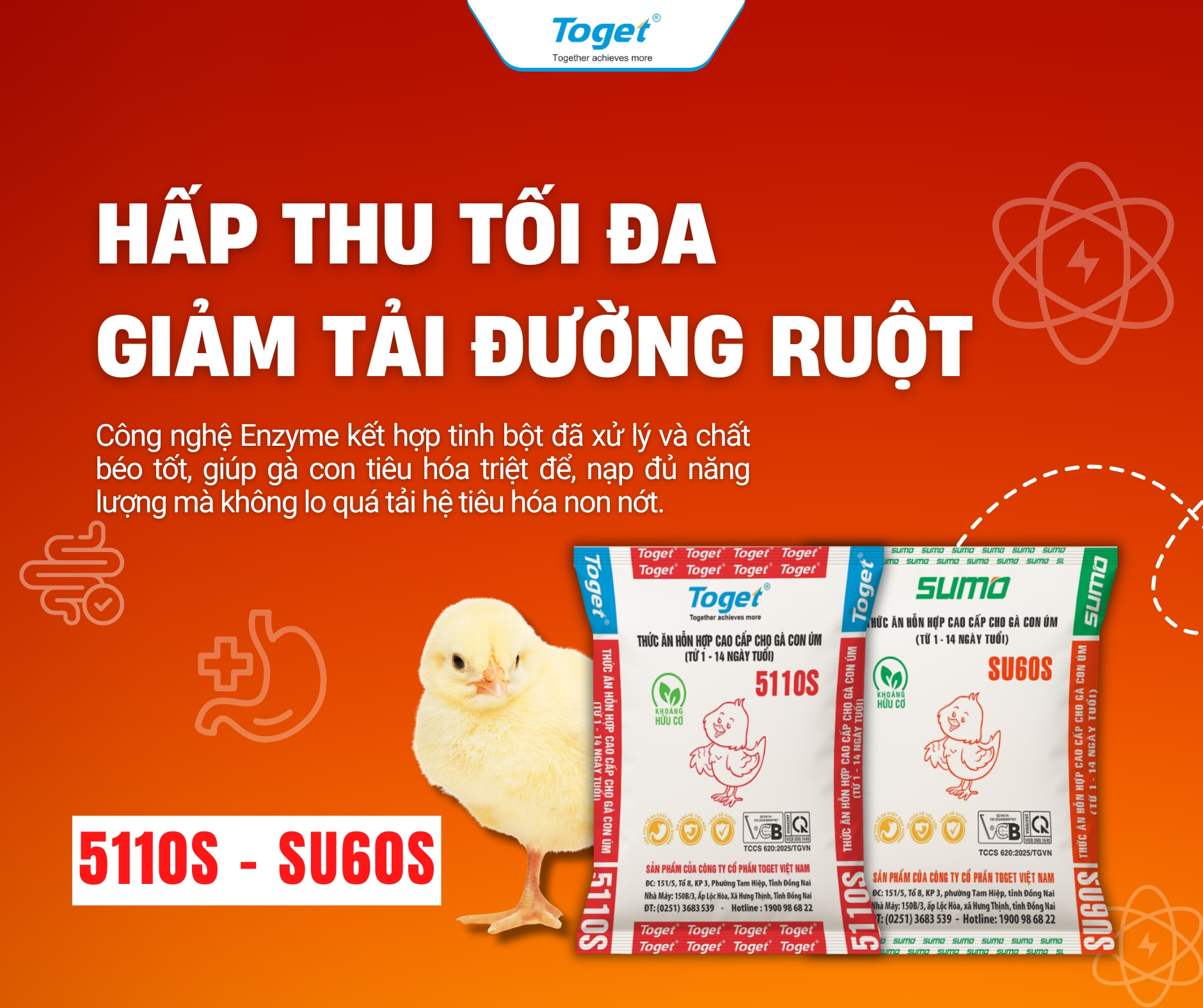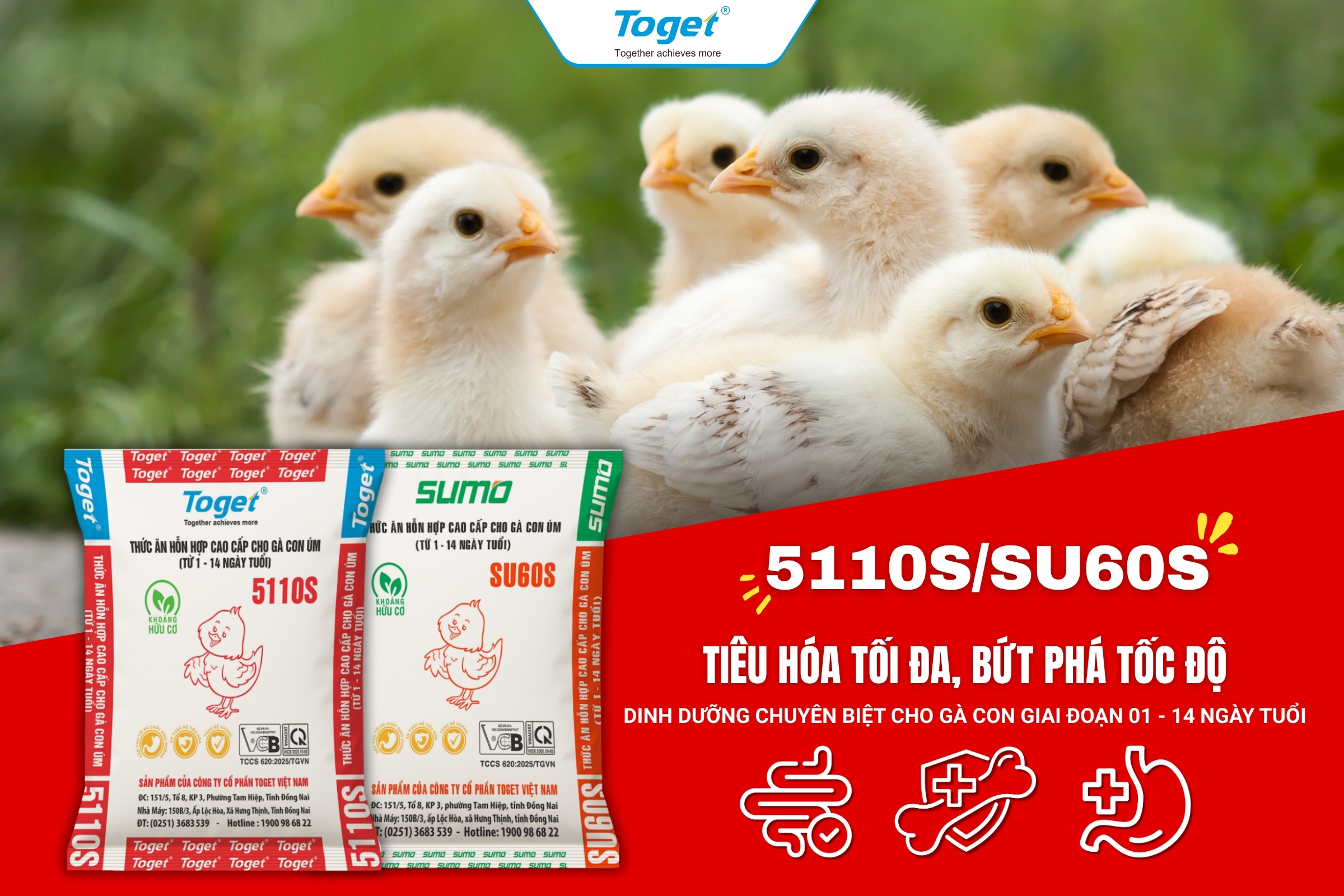 TOGET 5110S & SUMO SU60S được nghiên cứu và phát triển như một giải pháp dinh dưỡng chuyên biệt cho gà con úm từ 0–14 ngày tuổi. Công thức được xây dựng trên nền tảng dinh dưỡng dễ tiêu – dễ hấp thu – chuyển hóa nhanh, giúp gà con nhận đủ năng lượng ngay cả khi lượng ăn còn thấp, từ đó duy trì thân nhiệt ổn định và tăng trưởng đều trong giai đoạn nhạy cảm này.