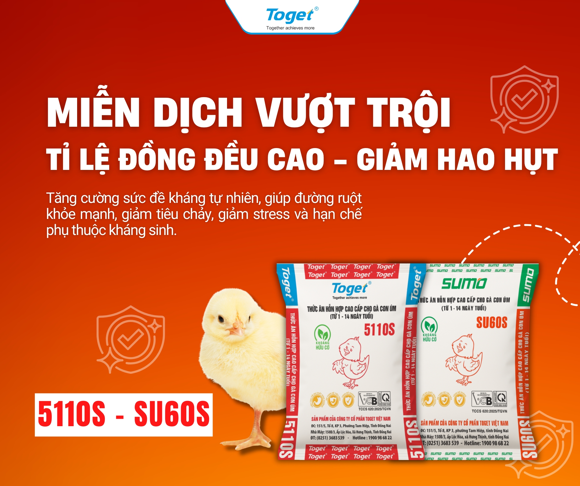 Nhờ được xây dựng đúng ngay từ 14 ngày đầu, TOGET 5110S & SUMO SU60S mang lại hiệu quả rõ rệt: gà con khỏe mạnh, ăn sớm, tiêu hóa tốt, tăng trọng đồng đều và giảm đáng kể tỷ lệ chết, loại thải đầu kỳ. Quan trọng hơn, nền móng dinh dưỡng vững chắc này giúp đàn gà đạt FCR thấp, tăng trưởng nhanh ở các giai đoạn tiếp theo, rút ngắn thời gian nuôi và nâng cao hiệu quả kinh tế toàn chu kỳ.